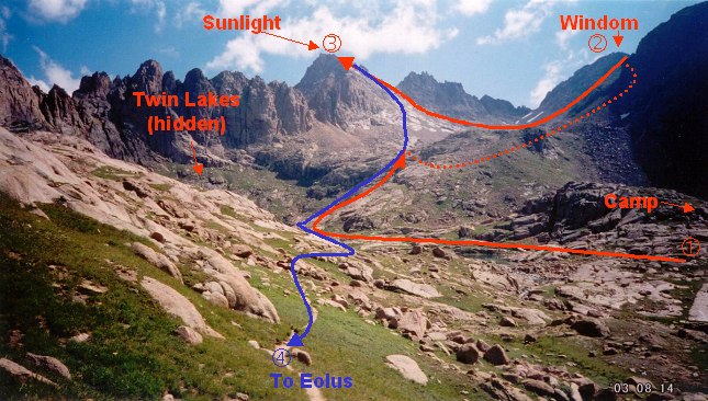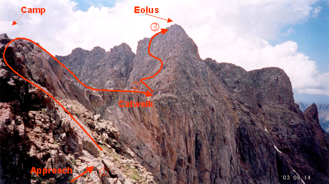 I followed a set of cairns to the saddle between North and South Eolus. The trail ascended directly up toward the summit of Eolus and underneath the “Catwalk” ridge. Just below the Catwalk face, a gully-like feature to the right allowed an ascent to the basin beneath North Eolus and the Saddle between North and South Eolus. The ascent up the 50-foot cliff to reach the saddle was a surprising 4th class effort, but I probably didn’t find the easiest way.