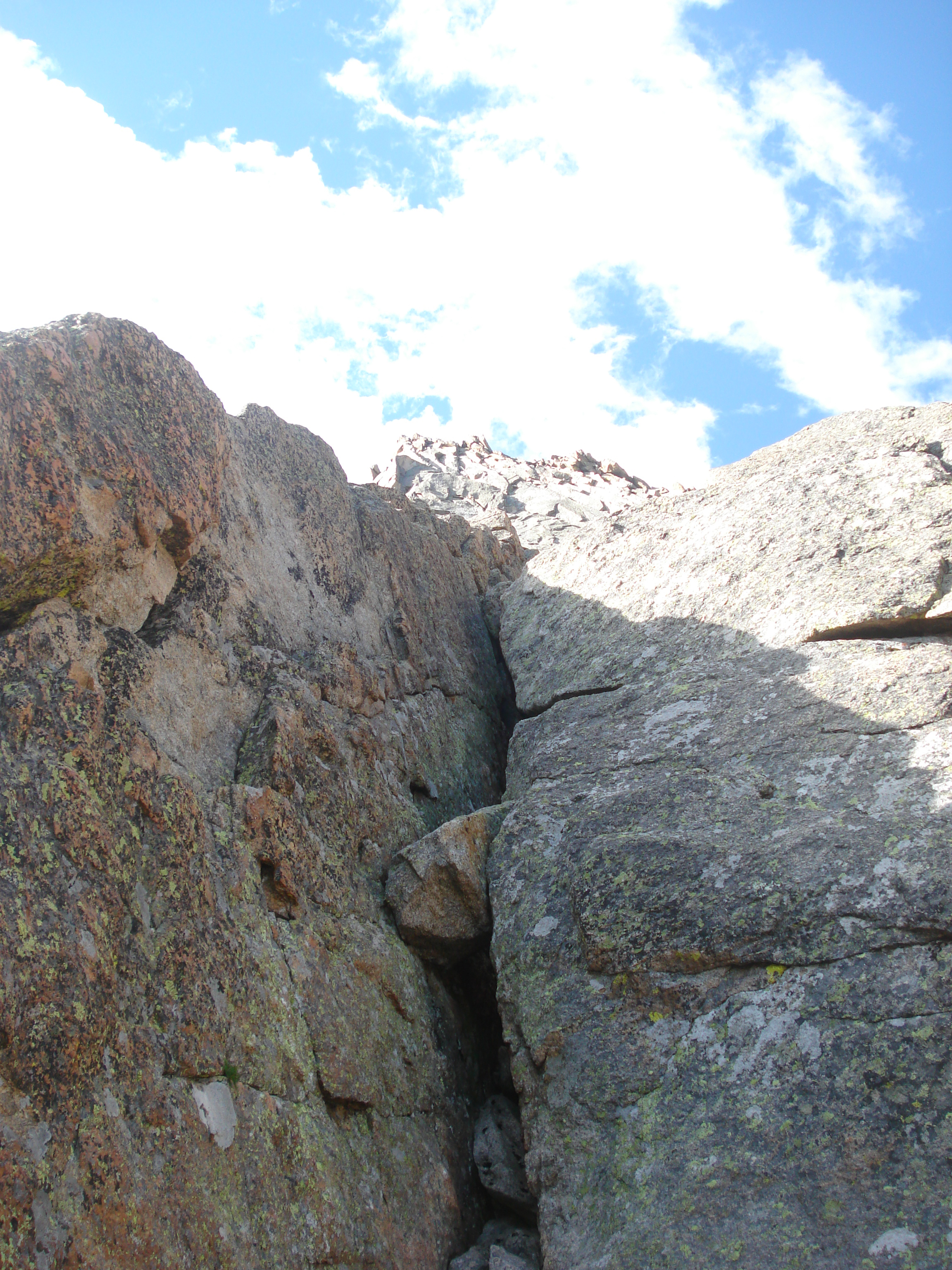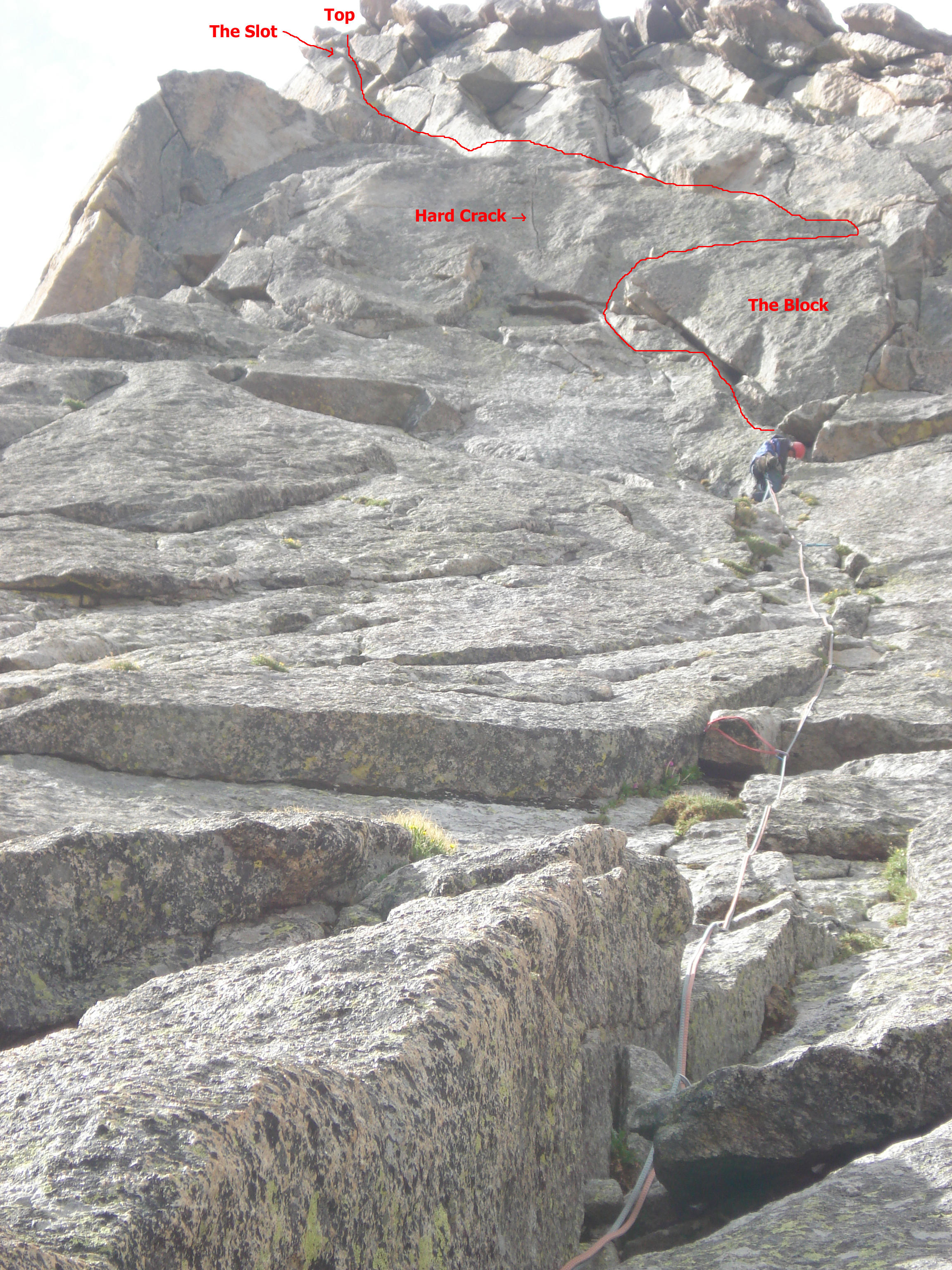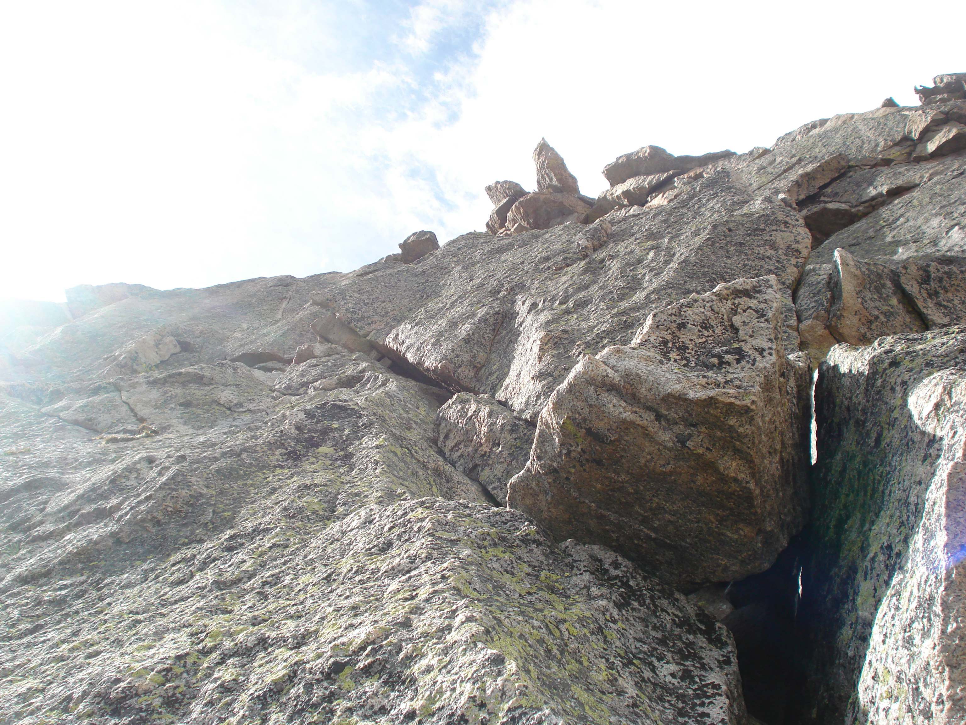 I looked up at the set of dihedral leading to the top and couldn’t tell which one I was suppose to climb. But I did know that I was supposed to reach the ridge at the top of the dihedral, so that meant I needed to climb the furthest left one. It started looking familiar, and I remembered climbing it easily in the past, but those days were gone (not forever I hope). I struggled up, and desperately searched for places to rest my Achilles. The only place I could find a rest was at the top of the corner with one foot on the either side of the ridge crest.