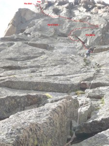I take the crack and belay near the top of the crack, for a 100 foot pitch; then he could take the last 100 feet to the summit, including the awesome step back to the ridge and ‘The Slot’ (Roach) leading to the top of the climb. Hmmm. Well, I did seem to recall that is the way he did it when he led it some years ago.