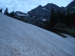 Upward and onward we hiked toward Loch Vale, taking the cutoff to Black Lake about 1.75 miles in (using the shortcut). We could hear the full creeks roaring by, but could not see a thing outside the flashlight beams. It wasn’t until we were hiking below Arrowhead that the sky started to get light. To that point, we’d walked on dirt and rocks; no snow any where near the trail. But as we approached Black Lake, we found a lot of snow. It was a delicate thing, walking across frozen snow in sneakers. But it only slowed us a bit, and we arrived at Black Lake at 5:45am.