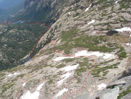 The view above the 4th belay with Brian near the 5th belay and a route line drawn to indicate the 6th pitch