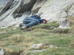 I stopped at a small pond to fill my water bottles, take off my wet hiking sock, and give my right Achilles tendon a rest. It only took 5 minutes to complete my chores, and then I worked my way past some sleeping biviers to the start of the North Ridge route, where Brian was catching a few winks.