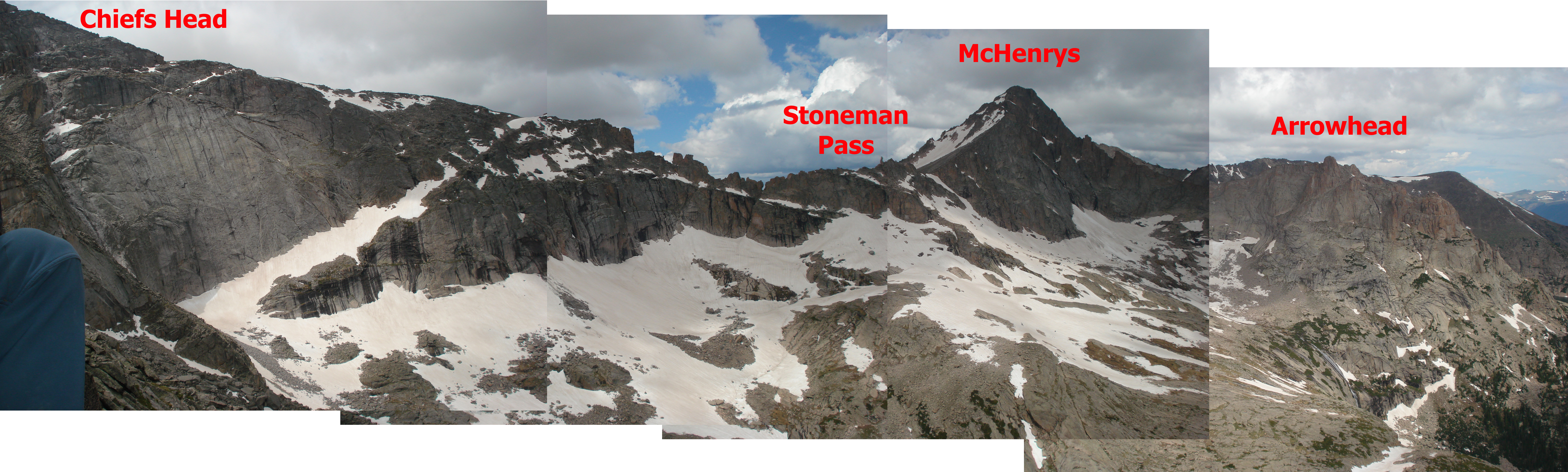 I started Brian’s belay with 3 tugs, and then I enjoyed the spectacular view of Glacier Gorge. My eyes followed our approach path, winding up from below Bear Lake, past Mills Lake and continuing beneath Storm Peak, Thatchtop and Arrowhead to reach Black Lake, and then winding through the willows and drainage creeks to reach the foot of Spearhead. It was breathtaking.