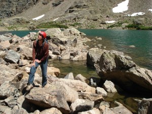 We took our time getting out.  We started with a dash for a water fill-up and then ‘skied’ down a snow field to Sky Pond that we skirted to link-up with the hiking trail.  We took some photos, admired the beautiful rocks of the area, and eventually worked our way down long enough to allow the iodine pills to dissolve.  We stopped at 3pm below the waterfall marking the transition to the Loch Vale level to eat lunch and consume every drop of liquid we felt confident wouldn’t make us sick.