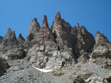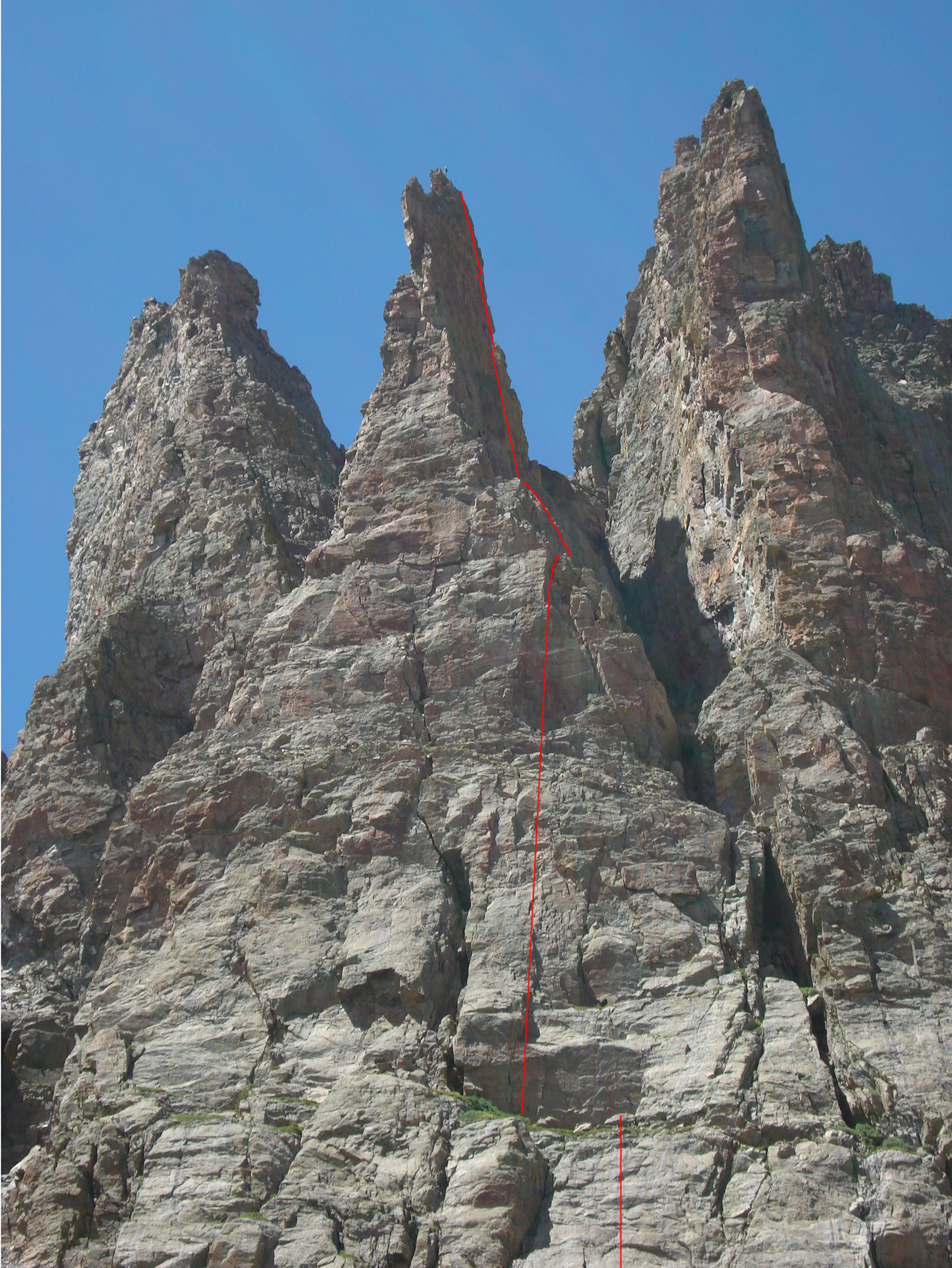 A view of Petit Grepon and South Face (5.8) route. Taken after descent.