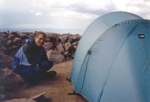 Brian next to his tent in the Longs Peak Boulderfield