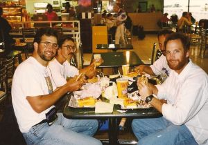 Rich (left end), Pete (glasses) and me (right end) during our Amazon river cruise in 1994.