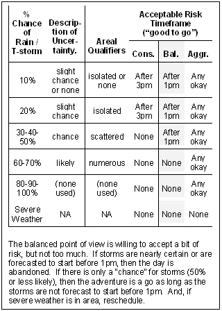 This chart is intended to be a bit simplistic for now. After we review the remaining three questions: (1) planning to avoid lightning, (2) reading the sky, and (3) reducing the risk, I’ll add the findings to the chart for each risk assumption level.