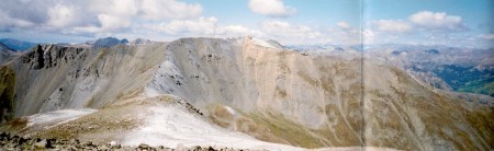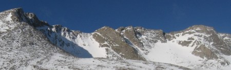 Once we reached the South Ridge, I hoped we were close so we’d be able to head back soon. But no. We still had a lengthy ridge traverse to reach the summit. And the wind became brutal. With the skis acting as sails, we were tossed around like toys. Brian even took a spill into some rocks after a big gust. But we made it. And, although it was a bit late for snow safety, the cold wind gave us confidence. We hurried back down the South Ridge past our ascent path to reach the a major gully, which probably would have been a better ascent path. (note: the standard ascent path would have been even better; see route photo.)