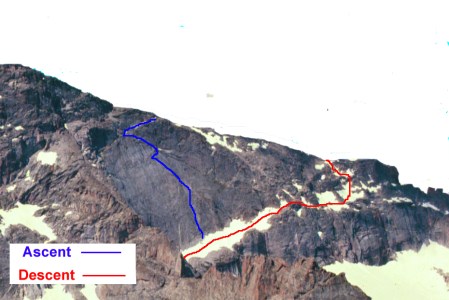 We were very confused because, according to the information we had collected, we should be at the summit ridge already. But there was no summit ridge in sight. It turned out that Rossiter’s topo only showed the unbroken portion of rock that was set into and below the full NW face. We didn’t have any certain knowledge or clue as to how to get to the summit ridge.
