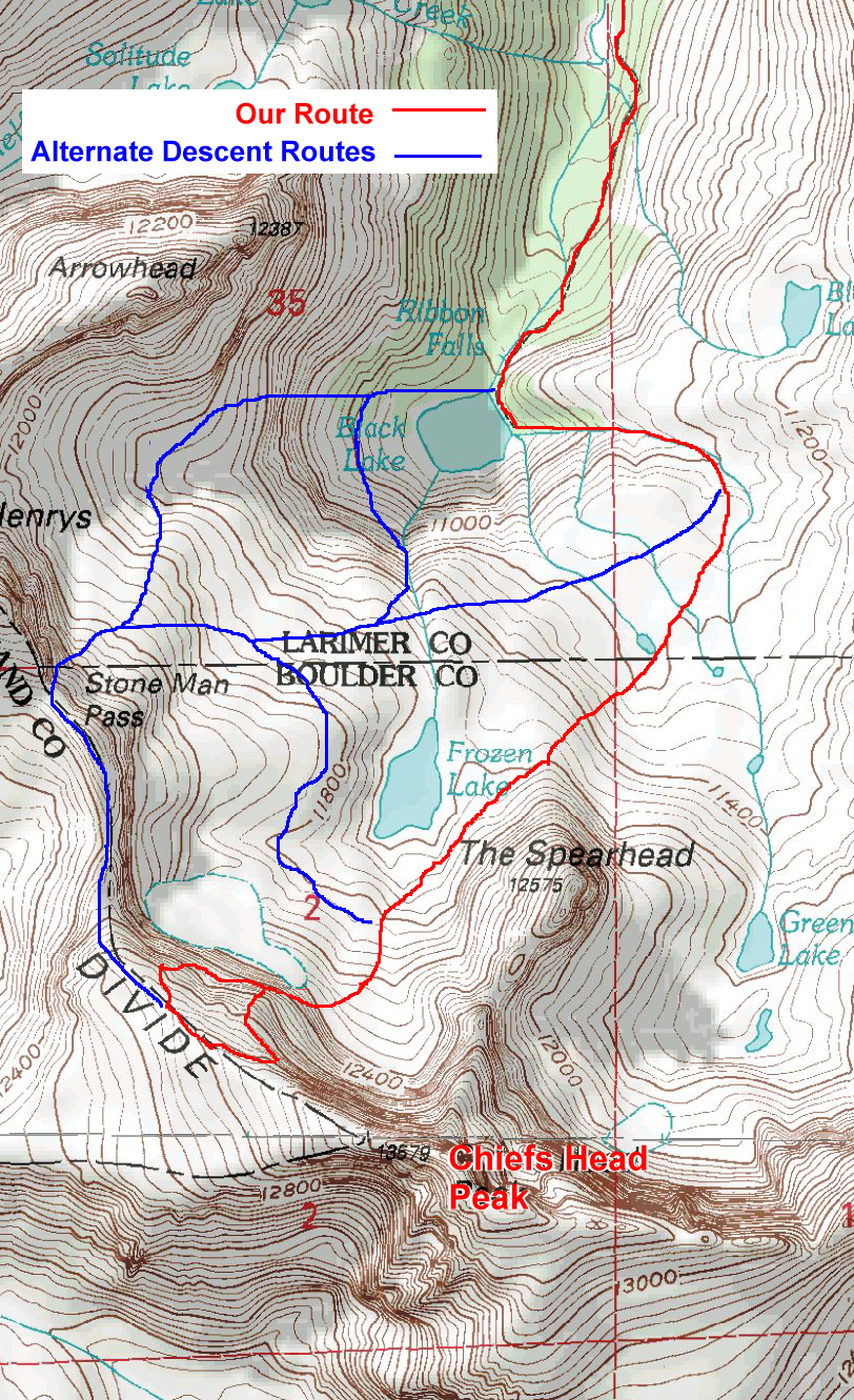 Much Ado About Nothing route plus descent. Photo from Longs Peak of Chiefs Head edited to highlight Chiefs Head features by removing other peaks (e,g,m Mt. Alice) from the background.
