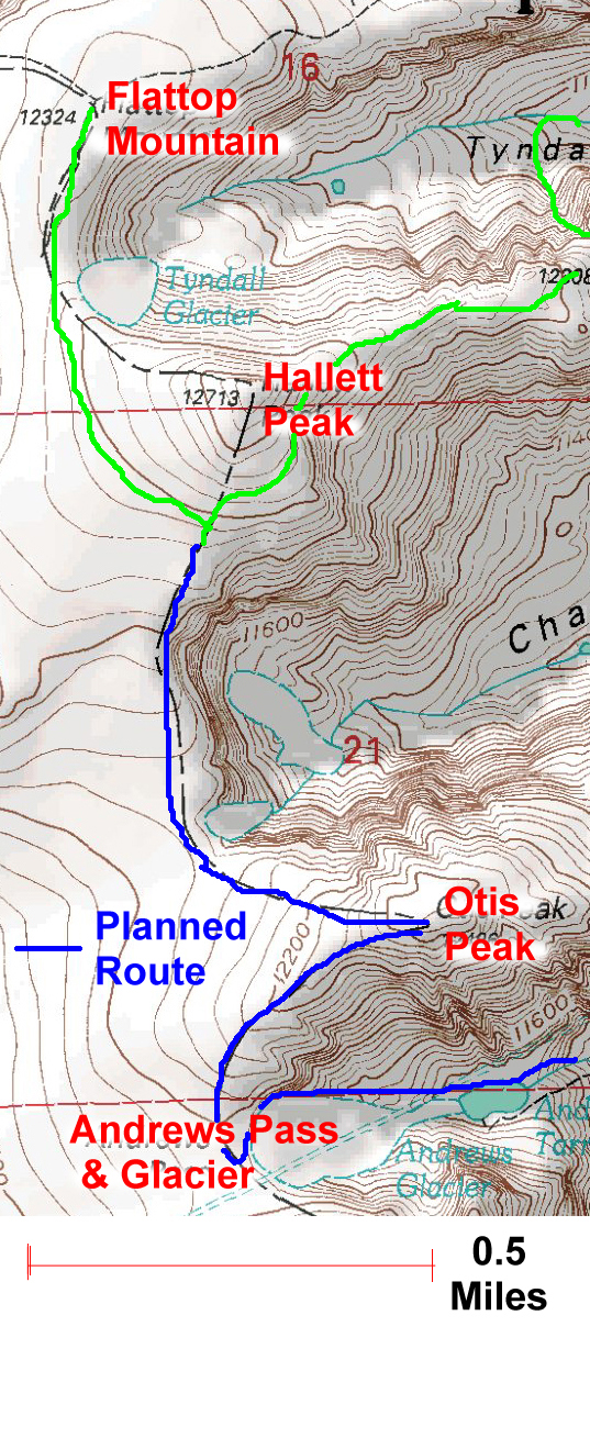 Our approximate route looping from Bear Lake to Flattop to Hallett toward Otis and then down Chaotic Glacier and Chaos Canyon, where we got lost. The line east from Chaos Canyon does not reveal the unpleasant wandering involved in such a bushwack.