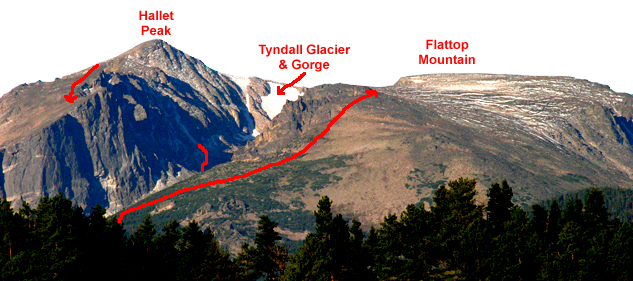 Hallett Peak (12,713′) sits on the Continental Divide between Tyndall Gorge (on the north) and Chaos Canyon (on the south).