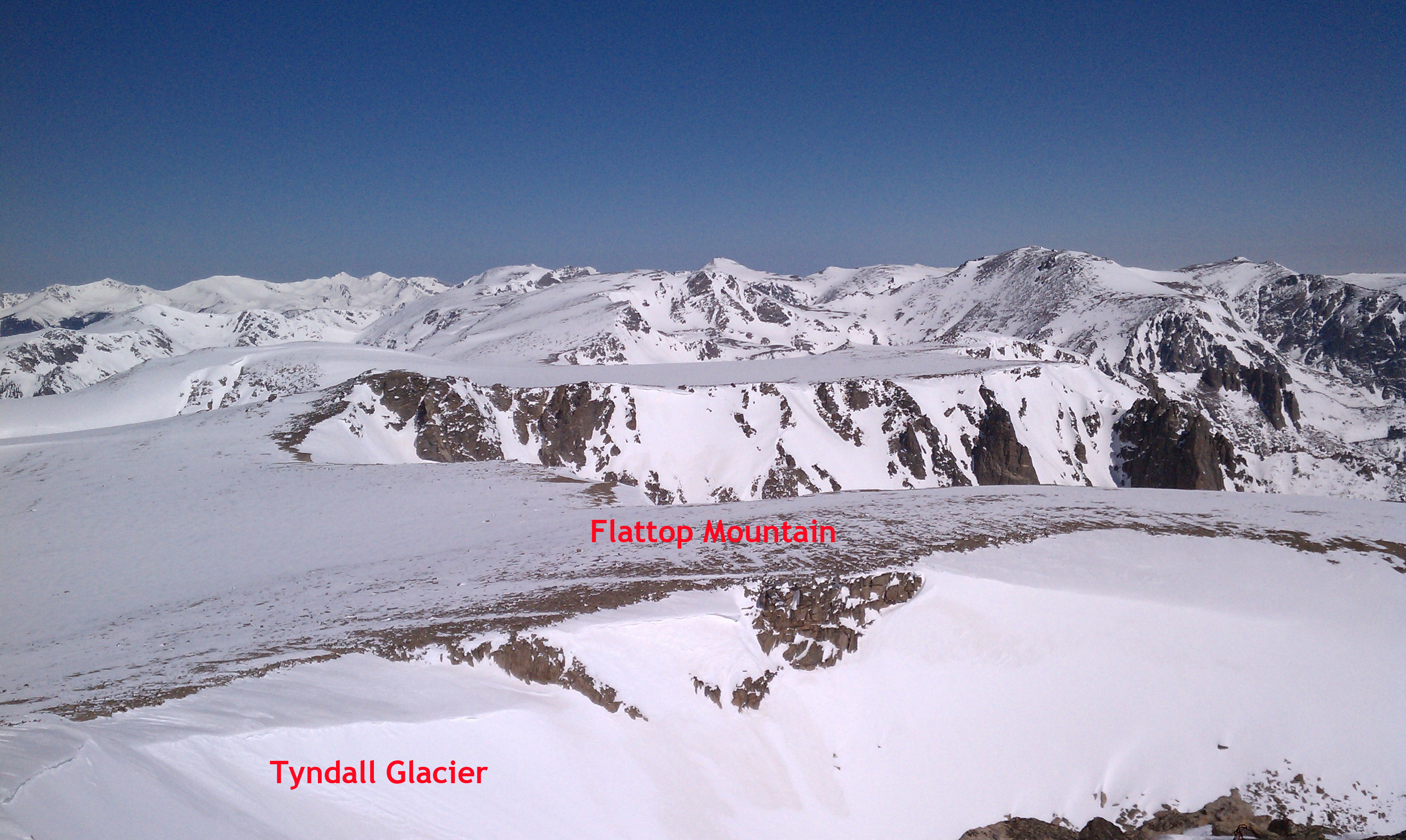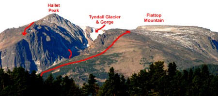The plan for the ascent was to skirt Bear Lake (9450′) which sits at the mouth of Tyndall Gorge, taking the Flattop Mountain Trail for 4.4 miles to the top of Flattop Mountain. The trail ascends the long north slope of Flattop that rises between Tyndall and Odessa Gorge.