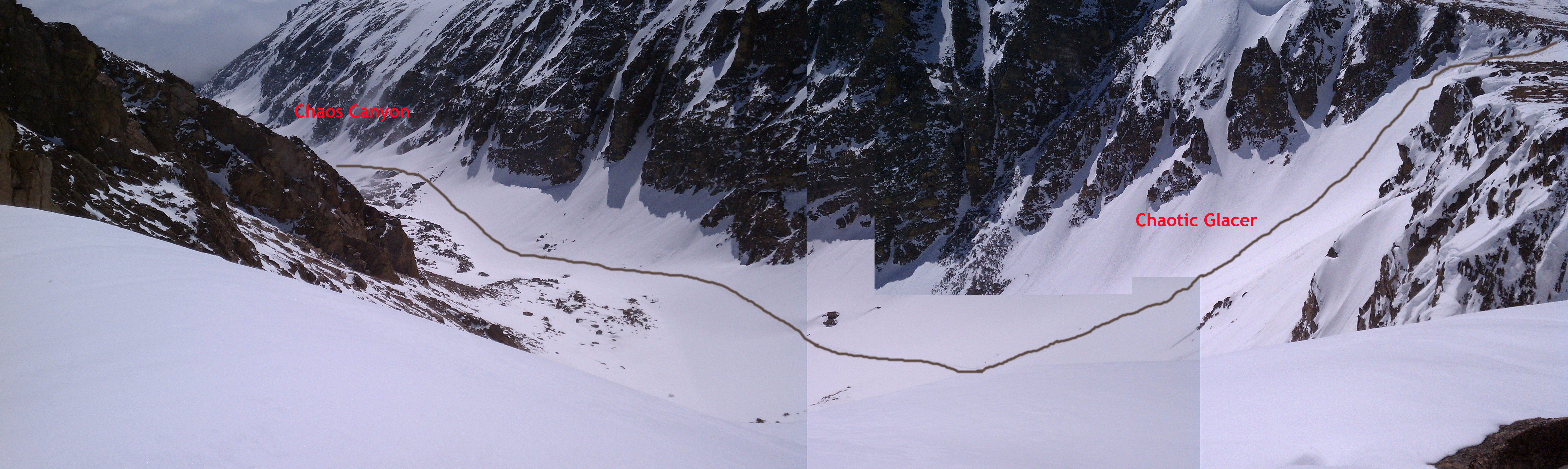 Once we reached the glacier at approximately 11am, the snow felt promising. It was soft in spots, sometimes as deep as 6-8 inches; I decided I would descend Chaotic Glacier and then hike out Chaos Canyon to Emerald Lake and back to Bear Lake. I had never descended that way before; it would be an adventure!