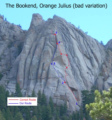 On the second pitch, we followed the ledge up and left to the edge of the face, then cut back right into a crack which we followed to a belay on a smaller ledge (5.4).