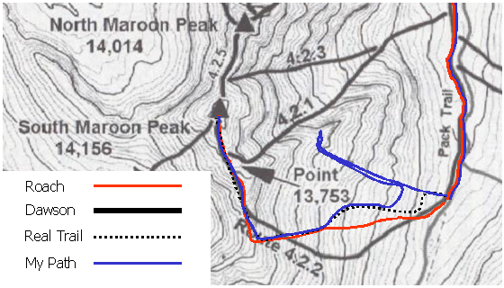 At approximately 7am, I reached the climbers trail for the South Ridge of SMB. It was about twenty yard before the spot where the trail crossed the West Maroon Creek for the first time (there was an earlier crossing of a tributary about 0.5 mile before), and was marked by two cairns. Since I couldn’t see the Bells from my position, I tried to figure out where I was and where I was going before heading up. It was very confusing.