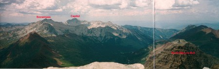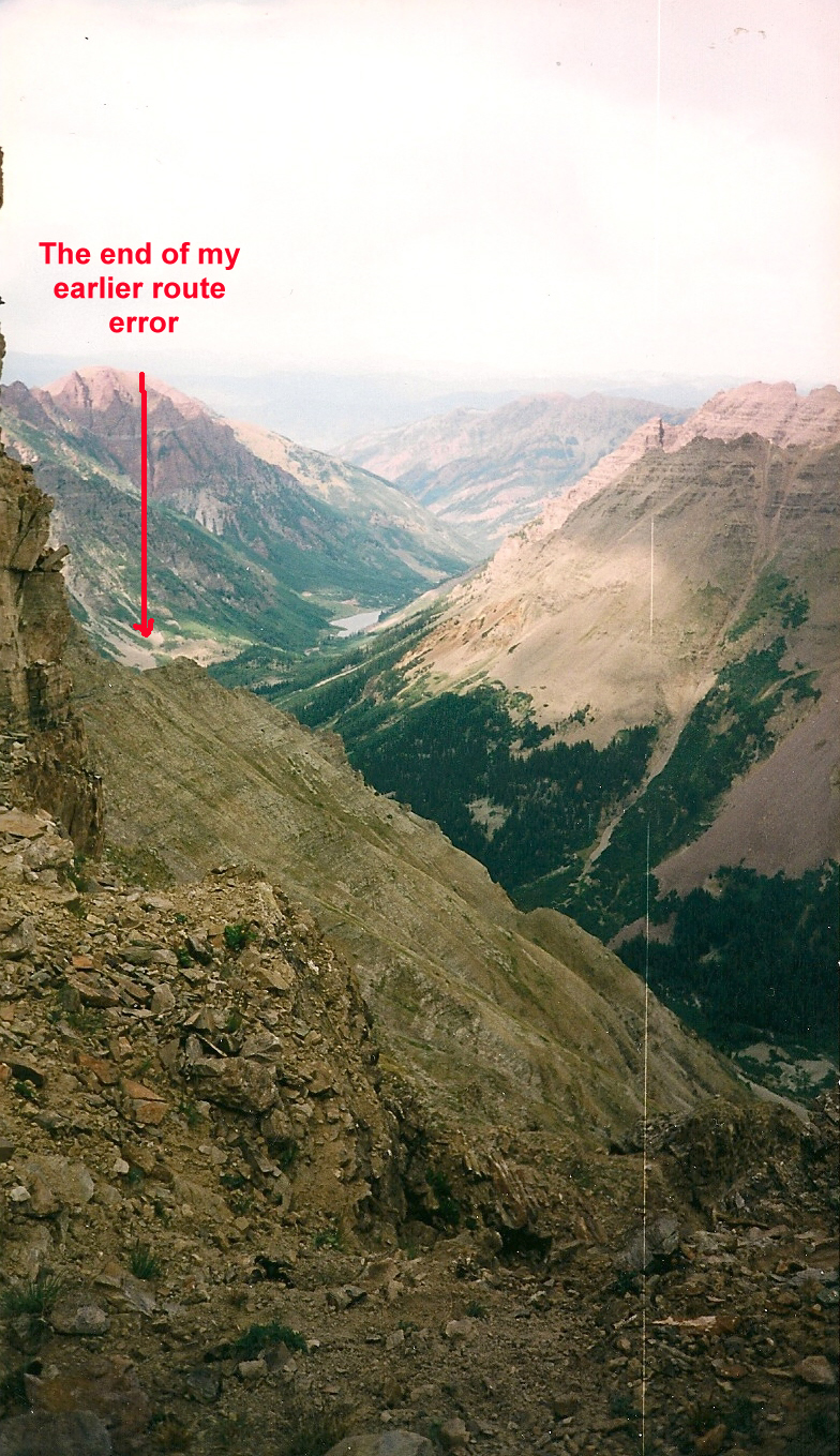 About 2 hours later, at 9:30am, I mounted the crest of the ridge at 12,500 ft that I figured was the Southeast Ridge of SMB and found myself looking across a gulf to North Maroon Bell. My eyes followed the ridgeline between the Bells to find SMB summit. My line to SMB summit was blocked by many nasty-looking towers. It wasn’t impossible, but very improbable that I would find a survivable path. Crap.