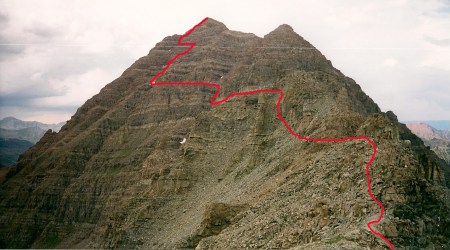 I finally had to admit that the original trail that I discarded at the 10,700 ft level was the right trail. But I didn’t think I could go back down 2,000 feet, traverse south to the next ridge (the SE Ridge!), and climb 3,200 feet in loose rock and “obscure route” finding in time to beat the weather. So my next task was to find a way to get to the SE Ridge, to the south of me, without losing too much altitude.