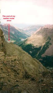 Then the damned trail took hard left and continued due south for an indeterminate distance at the 10,700′ level. I couldn’t believe that was the way to go. The key was the “SE Ridge coming down from the South ridge.” Dawson’s directions said to go to the south side of the SE ridge, and I couldn’t believe that I was supposed to go to the far side of the ridge to my far left; it just didn’t jive with Roach’s “climb west for 1.0 mile to reach South Ridge”. And I was in a hurry to beat the weather, so I didn’t have much time to think.