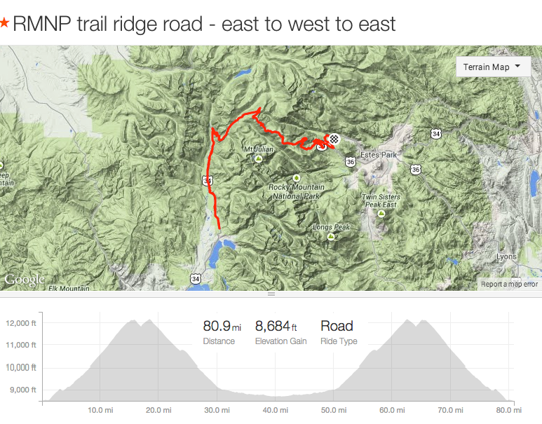 Our ride would start just outside Estes Park (and a bit inside the northern entrance to RMNP), and would take us over the Continental Divide, near the Colorado River’s headwaters, and end just outside of the western entrance to RMNP (near the town and body of water called “Grand Lake”). Of course, from there, we would have to turn around and retrace our path to get back home. Our cycling adventure would cover approximately 80 miles and would climb (and descend) about 8,700 feet of elevation, and nearly all of riding would between 9,000′ and 12,000′ of elevation (more mileage above 9000′ than the 120-mile Triple Bypass ride).