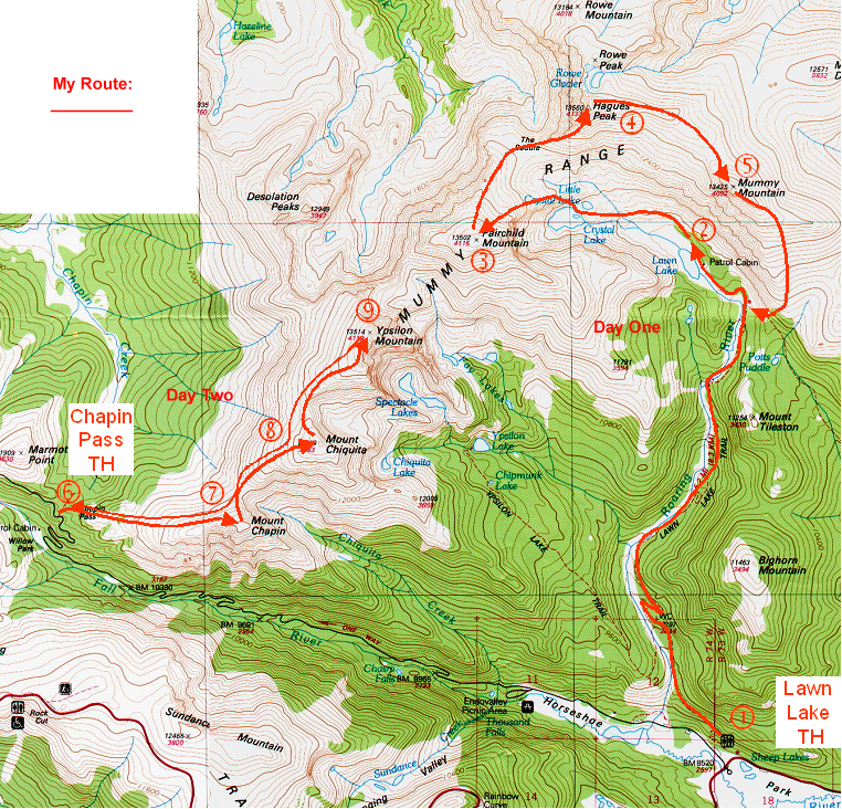 We would start from the Lawn Lake trailhead at the bottom of Old Fall River Road and hike to the bottom of Blitzen Ridge via the Ypsilon Lake trail spur. We would climb the ridge and then descend from Ypsilon Mountain to Chapin Pass, where we would use a stashed vehicle to drive back to the starting point. Yeah, driving would save ~4 miles of hiking and scrambling, but it would still be a hard day: 10+ miles of hiking & climbing from the Lawn Lake Trailhead (8540′) to the summit of Ypsilon Mountain via Ypsilon Lake and Blitzen Ridge to cover over 5000′ of elevation gain in 12 hours.