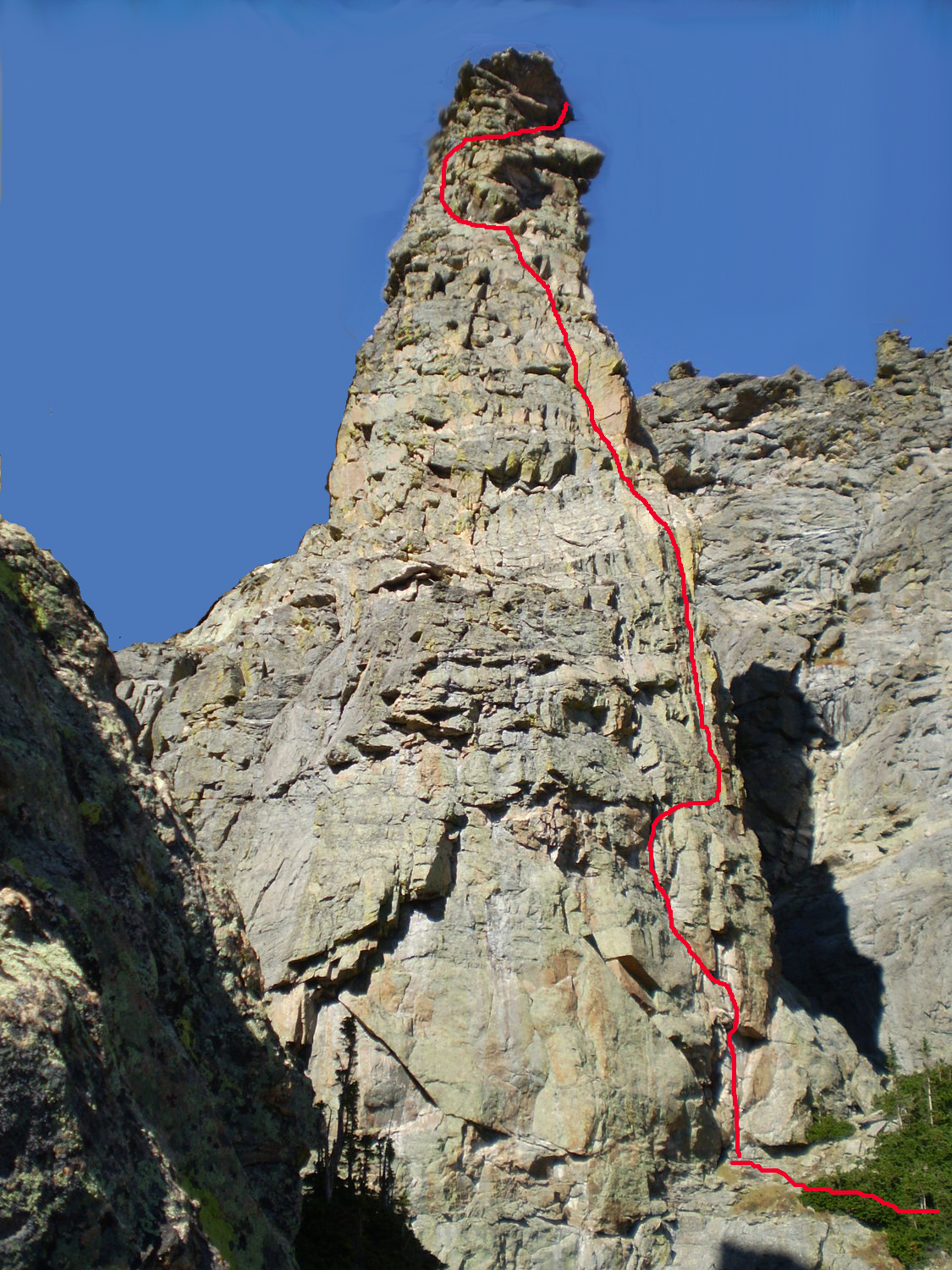 It was a great pitch! The climbing was awkward, but otherwise easy (5.5ish). I stayed on the south face until reaching the bottom of the summit block; I climbed NE over some blocks to reach the normal belay below the crux.