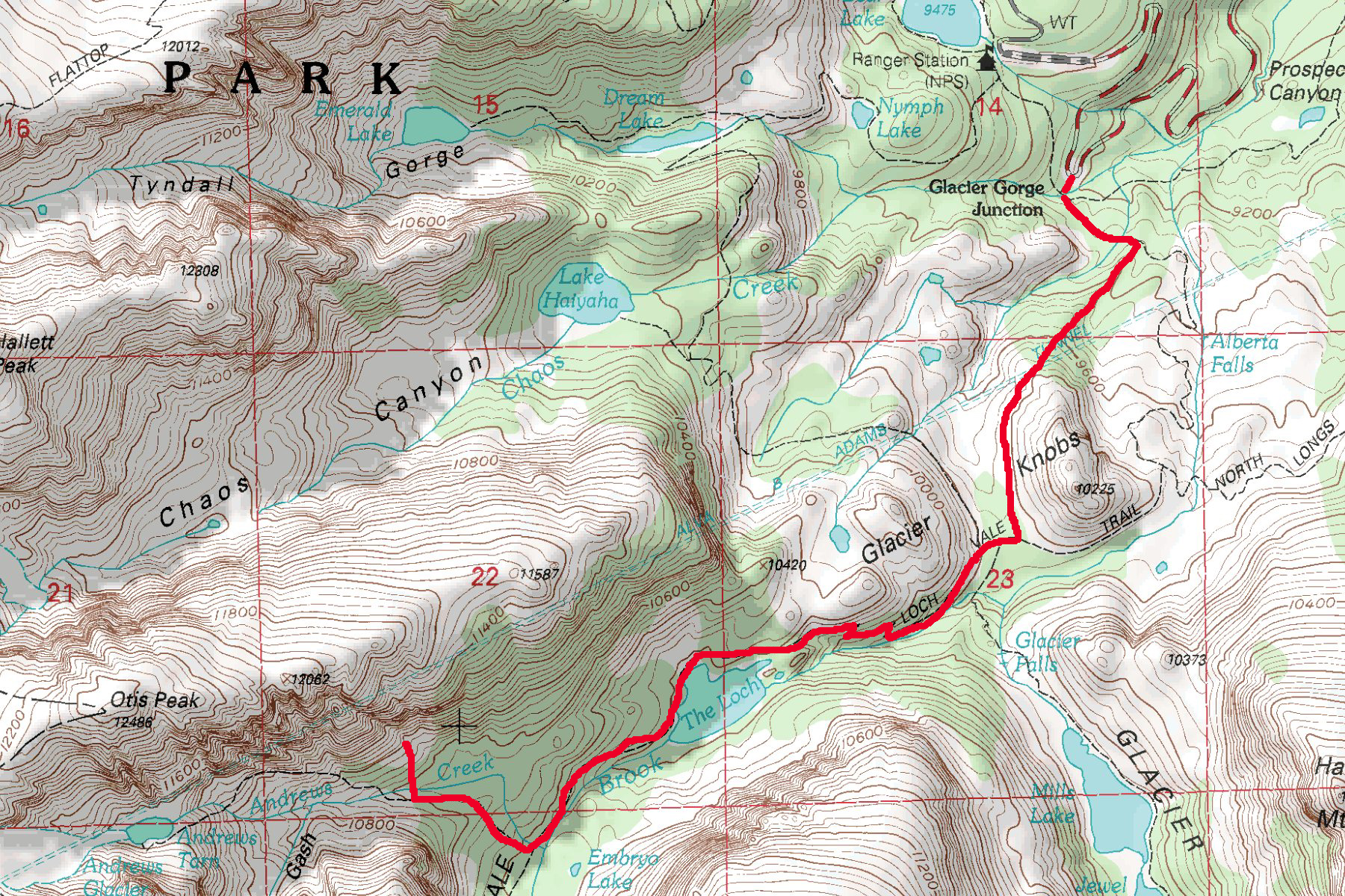 We started hiking at 4:45am on a clear night from a nearly empty parking lot. The trail went faster than the week before, and so the sun didn’t come up until just before we left the trees. Heading toward Zowie, we left the trail soon after leaving the trees; we turned left to cross the Andrews Glacier drainage creek, and then hiked uphill to the base of the climb.