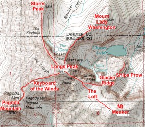 The core of the Longs Peak Massif is what I call The Great Cirque: the semi-circle of rock around Chasm Lake formed by Mt Meeker, Longs Peak & Mt. Lady Washington. And since they are within the semi-circle, I also include the Ships Prow, Glacier Ridge, and The Loft. Beyond the Great Cirque, the Longs Peak Massif arguably includes the following peaks and terrain features: Storm Peak, Key Board of the Winds, Pagoda. And that is where I draw the line to avoid being drawn into including every peak in the Front Range.