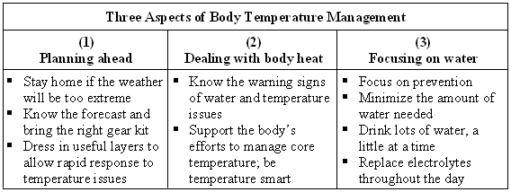 These strategies will help us achieve our body temperature management goals of staying healthy while building in flexibility for dealing with unexpected conditions. In this way, we give ourselves every opportunity to succeed safely.