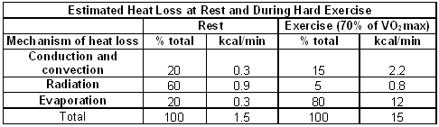 Largely through muscular activity most individuals generate 2000 to 5000 kilocalories (“Calories”) of heat per day; the rate depends upon their size, physical activity and state of nutrition. The body must get rid of this heat to prevent and increase in its temperatures that could have devastating effects. If no heat were lost, the body temperature of a relatively sedentary individual weighting 154 pounds producing only 2000 kilocalories per day would climb approximately 62F to 160F in twenty-four hours. (The temperature would climb at that rate as long as he was alive!)